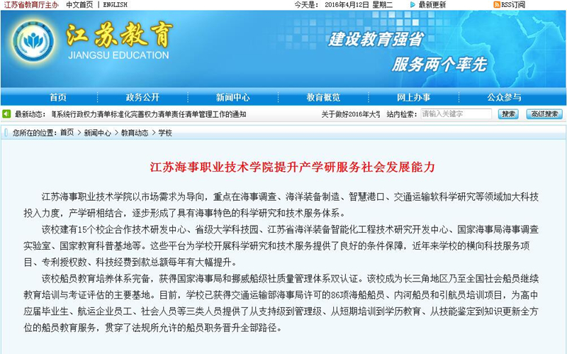 江苏海事职业技术学院以市场需求为导向,重点在海事调查、海洋装备制造、智慧港口、交通运输软科学研究等领域加大科技投入力度,产学研相结合,逐步形成了具有海事特色的科学研究和技术服务体系。
