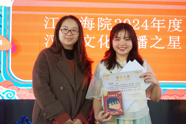 活动最后,国际教育学院党总支书记沈云为上届“悦读江苏”获奖选手和江苏海院2024汉语文化传播之星颁发证书,表彰他们在汉语文化传播方面做出的努力。获奖代表冯海娜发表感言,向一直以来帮助她的老师和同学们表示深深的感谢,并表示会继续她的文化传播之旅,用实际行动,让世界听到中国的声音,感受到汉语的魅力!