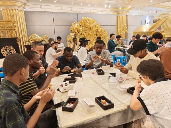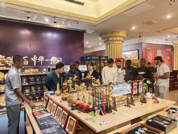 沉浸式体验,亲身感受“千锤百炼”。在金箔生产车间,讲解员介绍了“切金”“捶打”等关键工序。小小的一张金箔,需历经十二道工序、上下两万五千次的打磨,才能成为如今这般薄如蝉翼的模样。而在能工巧匠的手中,这些柔软的金箔又能变幻万千,幻化出不同的形态。来自尼日利亚的留学生万千山兴奋地说:“太神奇了,没想到黄金能被加工成如此纤薄的艺术品,这背后的耐心和专注令人敬佩。”