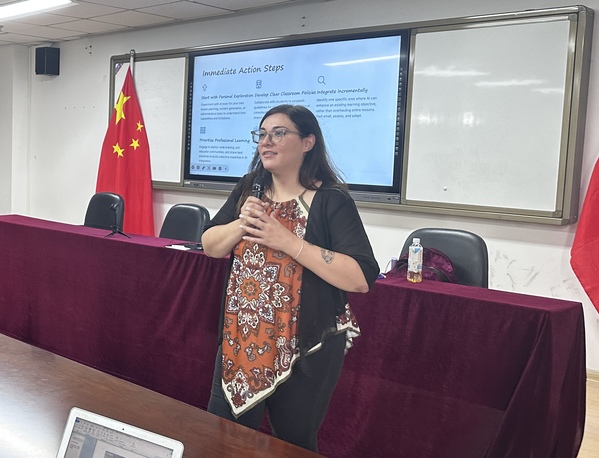 9月17日下午14:00,国际教育学院在海涵楼1117A多功能厅举办了主题为“Intentional AI in the Classroom”的外教英语沙龙。本次活动由外籍教师Vanessa Yiannikouros主讲,黄伟伟老师主持,全体国教学院教师和部分学生代表参加。沙龙聚焦人工智能在教育场景中的“有意化”应用,旨在引导师生思考如何通过审慎融合的方式,让AI成为赋能教学、深化学习体验的工具,同时守护教育的人文内核。