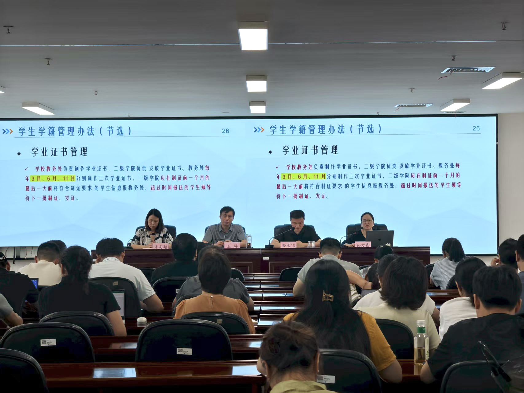 随后,学院副院长孙方霞围绕人才培养方案、学籍管理、学习成果认定与转换等教学管理制度开展了专题培训。她结合实例对重要条款和常见问题进行了深入浅出的解析,旨在提升辅导员和班主任对学生学业过程的指导能力,使其能够更精准地帮助学生规划学业、解决学习困难。