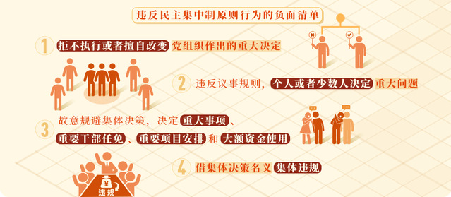 执纪监督中发现,有的党员领导干部我行我素、独断专行,对党组织的重大决定置若罔闻;有的搞家长制、一言堂,习惯于逢事先定调,重大问题不经班子成员充分酝酿和讨论就拍板,甚至对多数人的意见也置之不理;有的故意规避集体决策程序,把个人意见强加给集体、强加给组织,用个人决定代替组织决定;有的以“开会研究”为幌子,将集体决策程序作为掩饰集体违规的手段等。