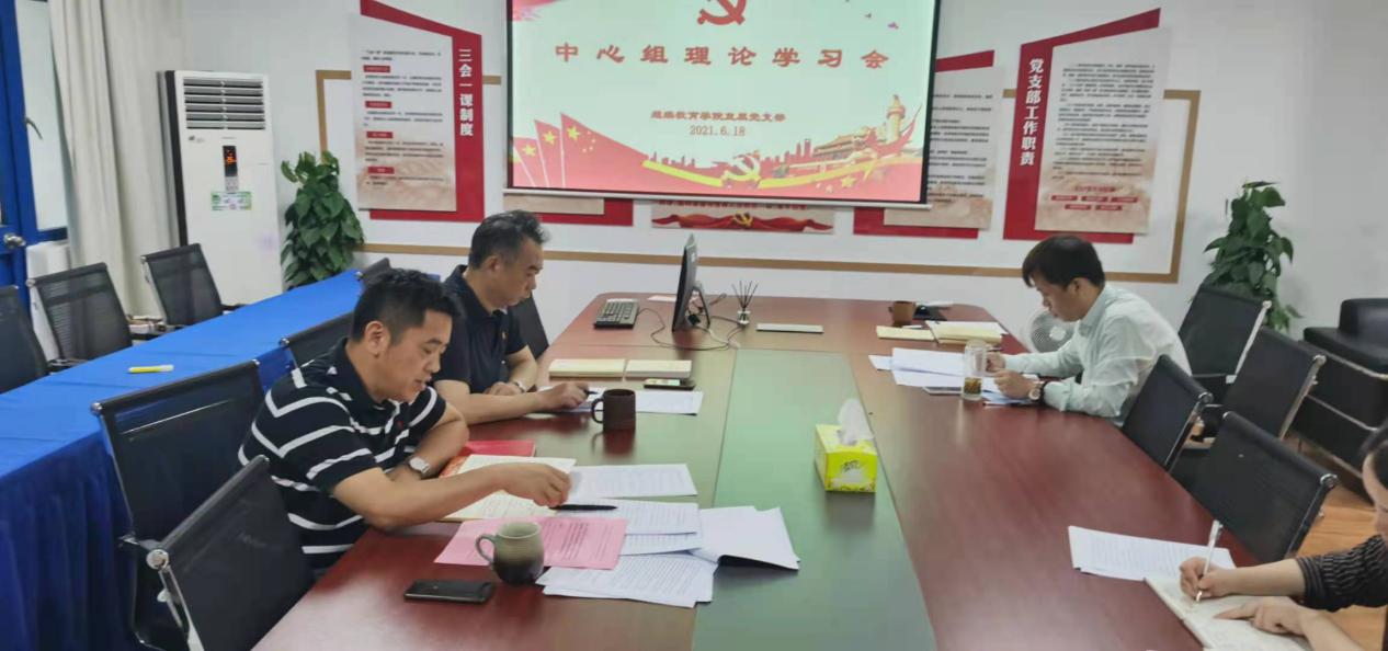 2021年6月18日,继续教育学院在会议室召开2021年度第三次理论学习中心组学习会。本次学习会由直属党支部书记袁昌富主持,理论学习中心组全体成员参加学习。