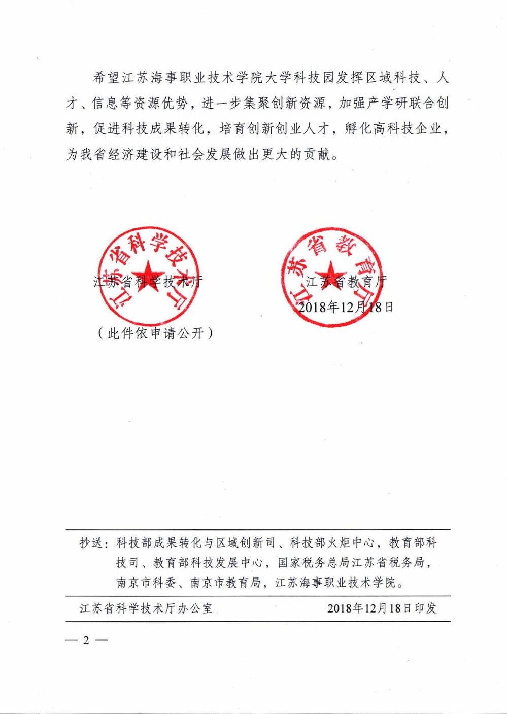 江苏海事职业技术学院大学科技园由江苏海事职业技术学院和南京伯利兹科技发展有限公司合作创建,该科技园位于南京市秦淮区白下路273号,现有建筑面积25500平方米,其中孵化场地面积10256平方米,总投资2亿元。2018年12月通过江苏省科技厅、教育厅验收认定为省级大学科技园。大学科技园致力于人才培养、科学研究、社会服务和文化传承的重要载体和孵化科技型中小企业的平台建设,已成为区域科技发展、战略创新体系建设的重要组成部分和协同创新、科技孵化的重要平台。