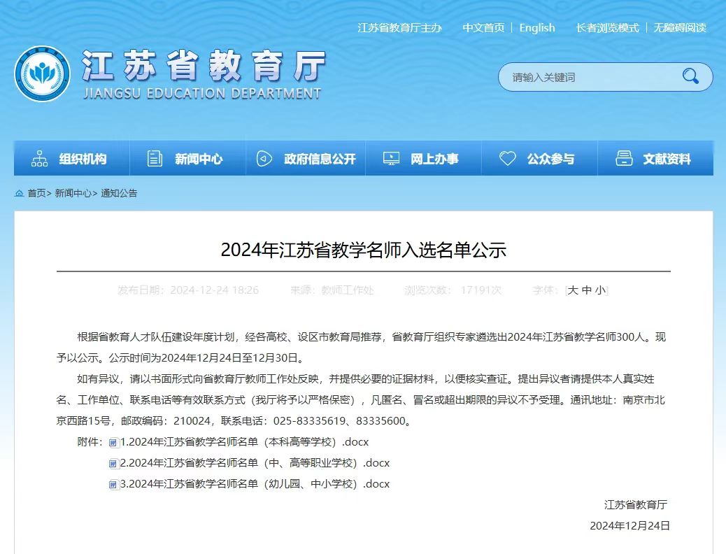 江苏省教学名师是省教育厅为全面贯彻习近平总书记关于教育的重要论述和中央人才工作会议精神,加快建设高素质专业化创新型教师队伍,制定的高层次教育人才支持计划。此次评选共选出2024年江苏省教学名师300人,其中高职院校44人。