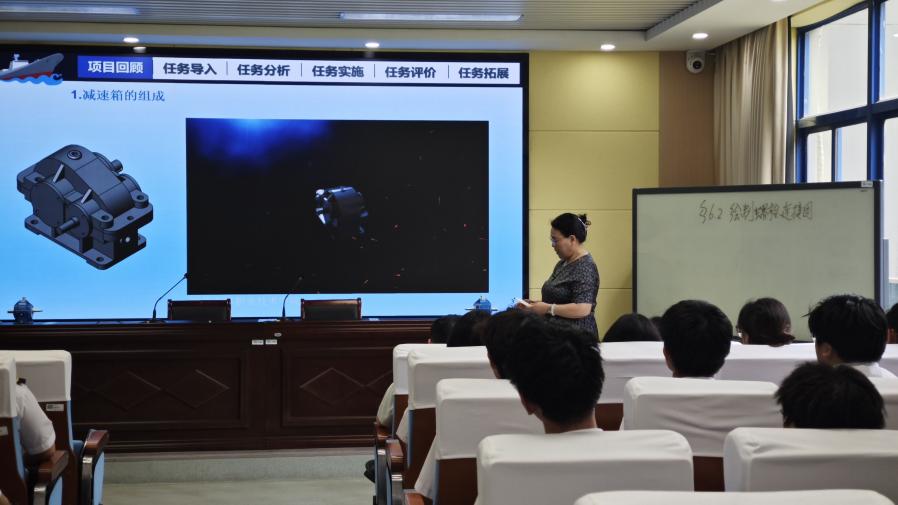 报告以我校教学名师瞿芳教授示范课《螺栓连接图的绘制》开场,课程围绕机械制图技能培养,生动展现了规范化教学全流程。她首先以减速箱零件互动问答切入主题,带领学生精准锚定“比例画法”“装配规范”等核心目标;通 过情境化设问“为何选螺栓而非螺钉”剖析应用场景,结合装配动画深化力学原理认知。接着采用“查表法解析国家标准”与“简化法训练比例计算”双轨教学,强化工程标准意识;课堂中实时投屏学生作品,引导学生自主发现“中心线误用”“垫圈斜度偏差”等问题,并以“规范绘图挑战赛”激发实操热情。瞿教授从减速箱结构分解到螺栓连接装配规范,层层递进,逐步引导,将职业教育“精于工、匠于心”的理念融入课堂实践。