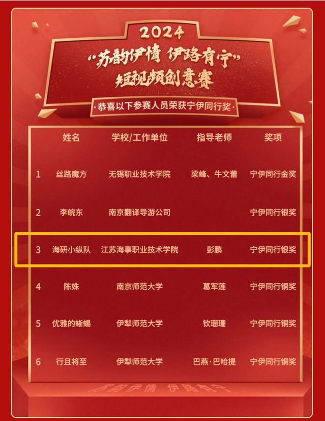 “苏韵伊情 伊路有宁”作为江苏援伊·南京工作组核心工作的深刻体现,在此次“援疆+赛事”中,充分发挥了其作为文化交流桥梁与纽带的重要作用。邮轮学院积极响应并践行“以赛搭台、以赛促学、以赛促业”的工作理念,通过参与此次比赛,以实际行动参与了宁伊两地的文化旅游交流与合作,更将为学院的人才培养探索出一条新颖且富有成效的路径。