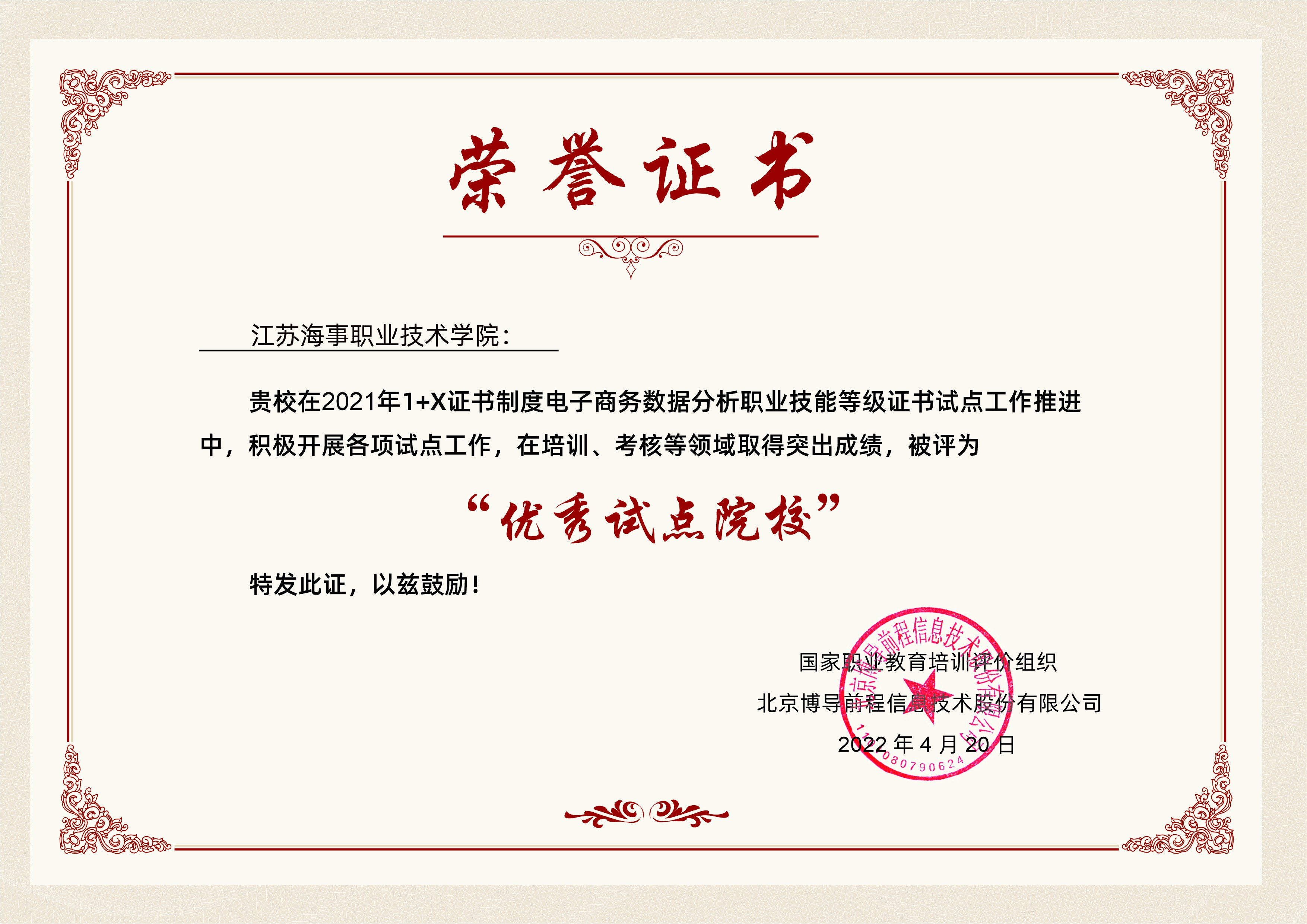 2022年被国家职业教育培训评价组织评为“1+X”优秀试点院校、优秀考核站点
