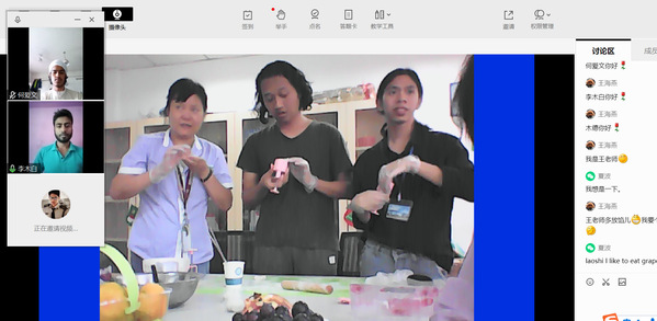 活动伊始,对外汉语教师冯俊英通过网络直播向我校19级、20级留学生讲解了“后羿射日”,“嫦娥奔月”,“玉兔捣药”,“吴刚折桂”等与中秋节相关的神话故事,并详细介绍了中秋吃月饼赏月的习俗。王婷老师、王玫老师一起带领在校留学生学习制作冰皮月饼,从和面、揉面团、包馅儿,再到压制成型、成品包装等等,留学生一步一步聚精会神地学习。一块块花朵形状的月饼很快就制作好了,得到了线上留学生们的一阵阵欢呼。活动现场节日氛围浓烈,一片团圆和谐景象。