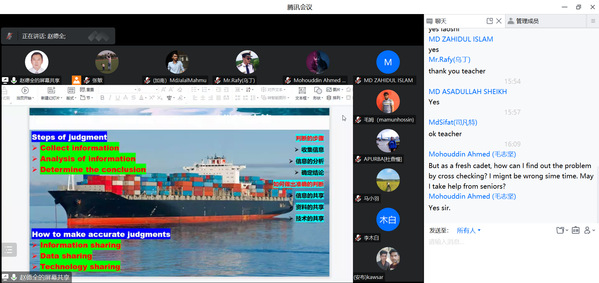 赵船长从工作态度、人文意识、通信沟通等十个方面阐释了船员在实习期间应该注意的安全事项和应对突发事件的方法。全体2019级毕业留学生在线认真聆听了讲座,并与赵船长进行了积极互动。